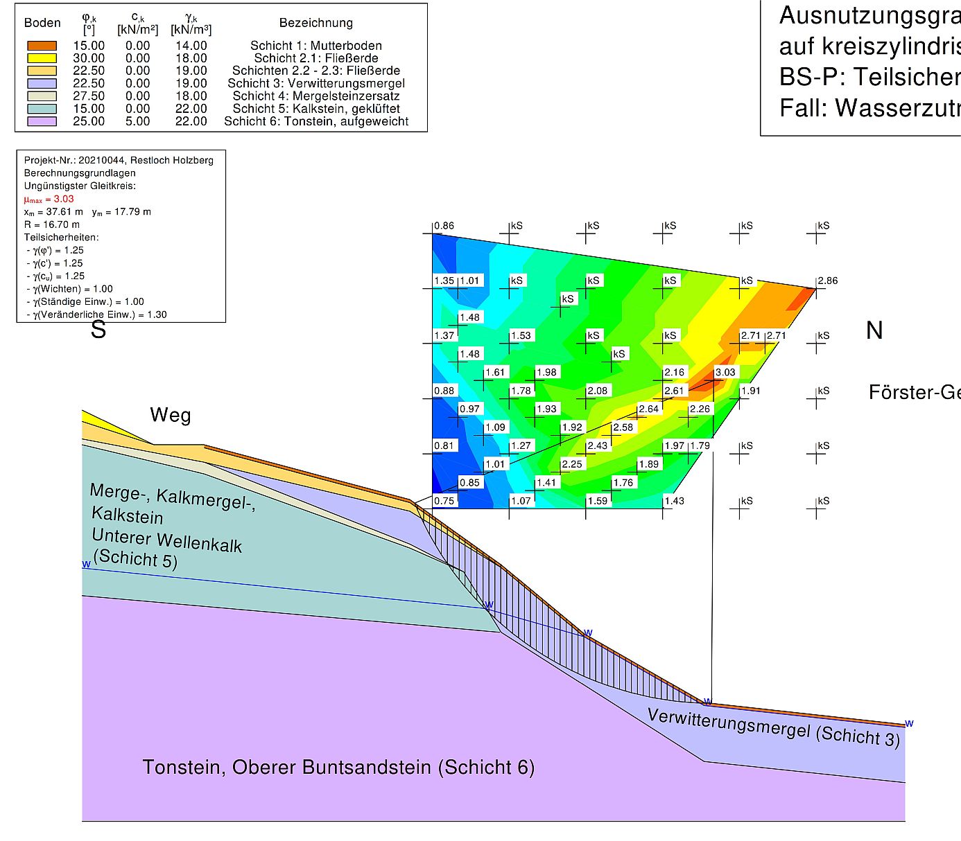 Nach erheblichen Niederschlägen kam es zu einer Hangrutschung mit Verschiebungen im Bereich von 1 bis 2m und den Versatz von mehr als 500t Material. Für die am Hangfuß liegenden Grundstücke und deren Bebauung ist eine Gefährdung geben. Erster Schritt war die geometrische Messaufnahme, die Baugrunduntersuchung und die rechnerische Einschätzung der Situation. Die Ermittlung des Schadmechanismus und der Nachweis der Ursache gelang zweifelsfrei. Ausgehend hiervon können Risikobewertung vorgenommen und Schutzmaßnahmen bestimmt werden.