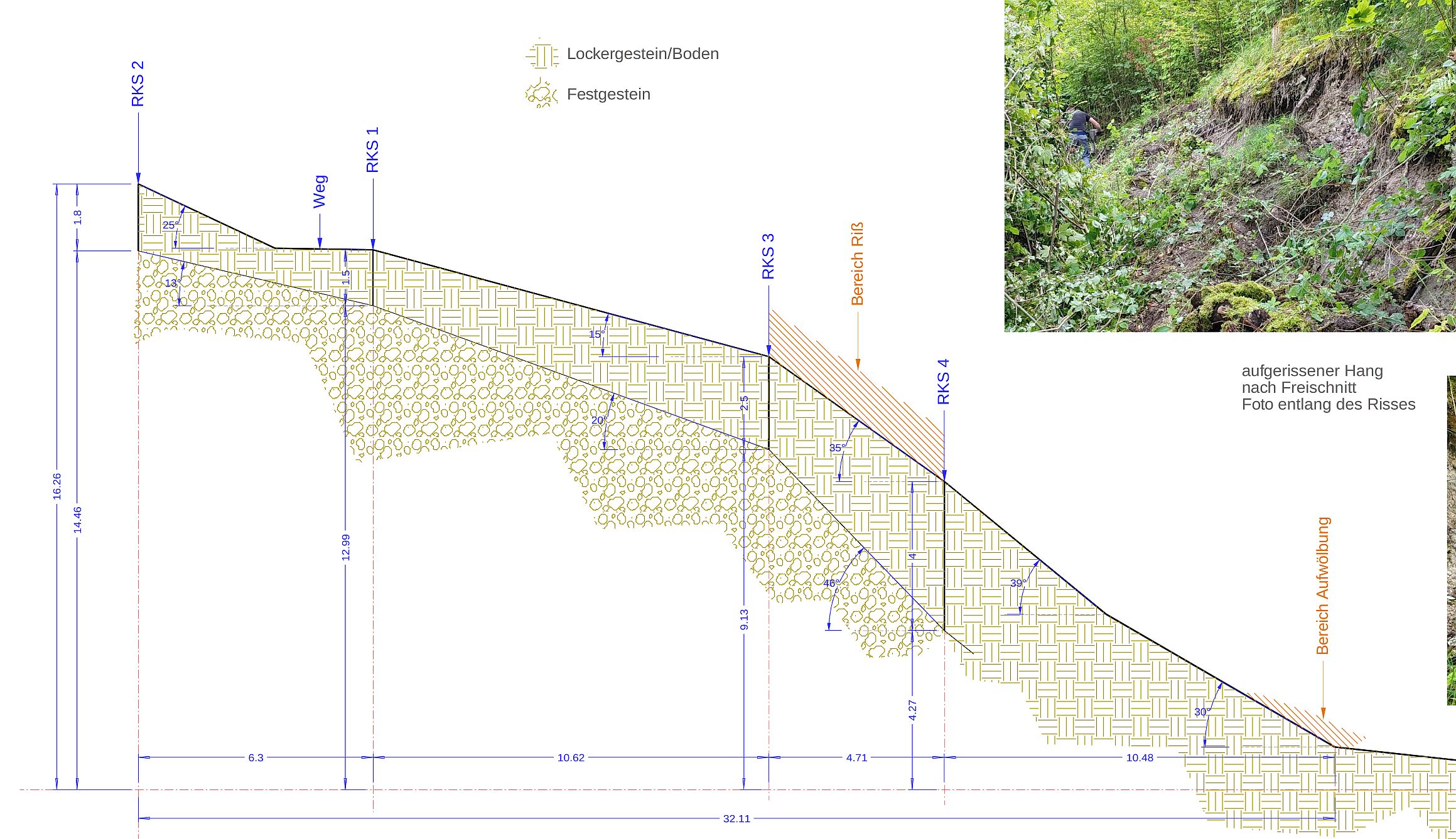Nach erheblichen Niederschlägen kam es zu einer Hangrutschung mit Verschiebungen im Bereich von 1 bis 2m und den Versatz von mehr als 500t Material. Für die am Hangfuß liegenden Grundstücke und deren Bebauung ist eine Gefährdung geben. Erster Schritt war die geometrische Messaufnahme, die Baugrunduntersuchung und die rechnerische Einschätzung der Situation. Die Ermittlung des Schadmechanismus und der Nachweis der Ursache gelang zweifelsfrei. Ausgehend hiervon können Risikobewertung vorgenommen und Schutzmaßnahmen bestimmt werden.